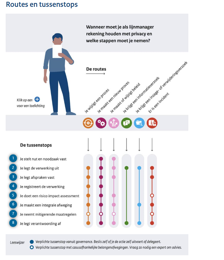 Het instrument bestaat uit zes routes (situaties) met elk een serie tussenstops oftewel acties. Samen geeft dit stappenplan een manager praktische handvatten om te kunnen voldoen aan de AVG. Zonder eerst in de theorie te duiken, leren managers langs de werkpraktijk over privacy en kunnen ze weloverwogen acties ondernemen.”